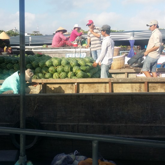 Anyway, we were in the boat on our way to this floating market. However, it is not like the one in Bangkok, Thailand, which is like an infestation of all these little boats with people on it buying and selling stuff. This was bigger, meaning it was more business to business. Big boats full of watermelons, pineapples and lots of other things were moving slowly through the water. Other boats came next to them, they discussed something and after paying money the throwing around with watermelons began, hi hi.