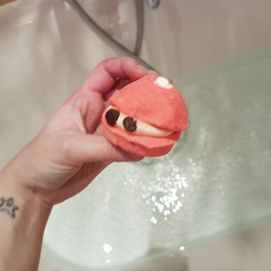 In the Lush Christmas gift box Jingle Bells you will find Peeping Santa. He is a cute little Bubble Bar with chocolate eyes. Do not eat them though! Just run your bath water, hold him under the running tap and help him crumble a bit. Your bath will smell great and turn red!