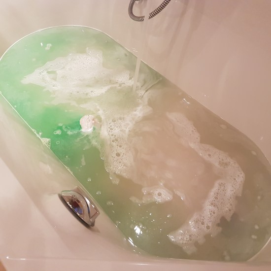 It seems a bit harsh to throw him in the bath like that, being so cute and all, but still I did. I am glad, cause I was very surprised by what happened. Though his design is pretty white and may be a bit boring colorwise, the surprise is in its middle: green! The whole bathwater turns green, which is a good look for Christmas.