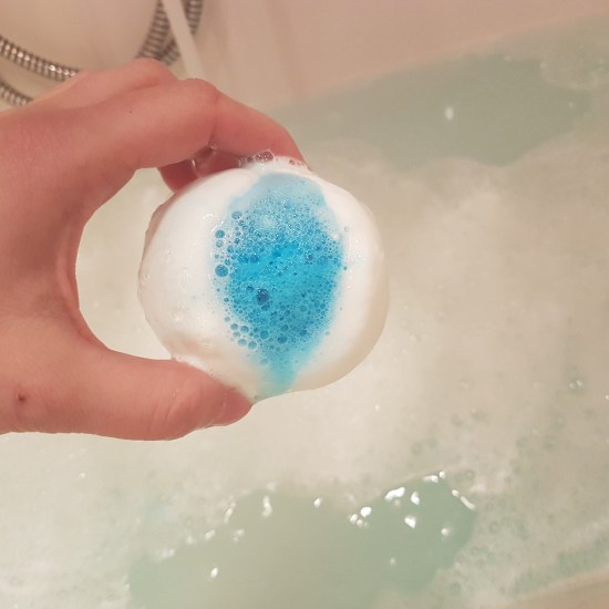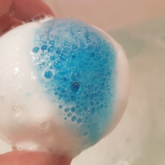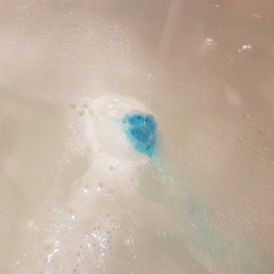 It actually started to break down a bit when I got it out of its package, which apparently means that it will probably be more foamy than the sturdier bath bombs. I am not sure it is true, but indeed when I did put it in the warm water, the foam started to show. And what is even more interesting, the white ball started to dissolve with a lot of blue and yellow color, which looked amazing. The bath water turned turquoise and it was really beautiful.