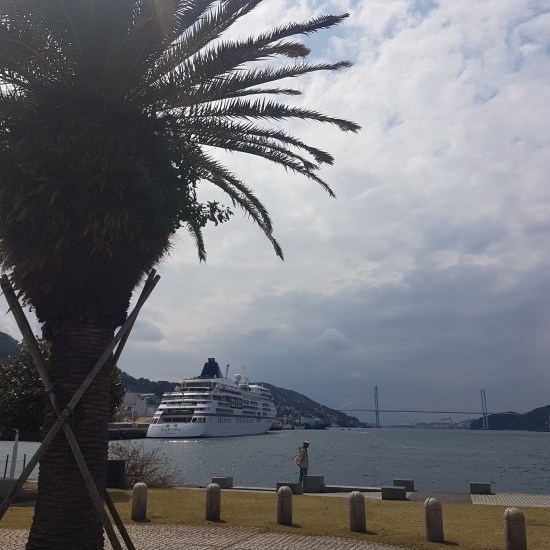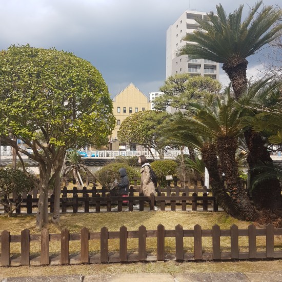 After the museum we walked through the beautiful harbor of Nagasaki which had a beautiful park where people were all having a picknick together or with their kids. Or with their dogs, cause everybody has a dachshund here. It was a lovely day: warm sunshine, though sometimes there was a little bit of rain that included a very cold wind. Nagasaki apparently has one of the most beautiful skylines of the world. I have seen better ones, but it still is very breathtaking.