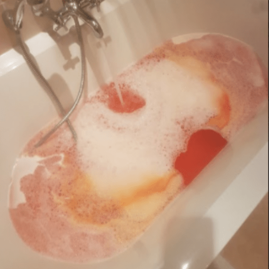 What I do really like about this baby is that it explodes pretty neatly in the bath. It is not just red and white, there is an orange core that makes for a spectacular fireworks-kinda vibe when thrown in the bath tub. The water gets to be very orange, which is amazing. I sent this guy a selfie of me in the bath (a very proper one, you dirty people) and he was like: wow, that water is crazy orange. It is, I love my country!