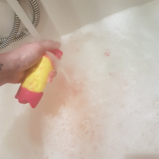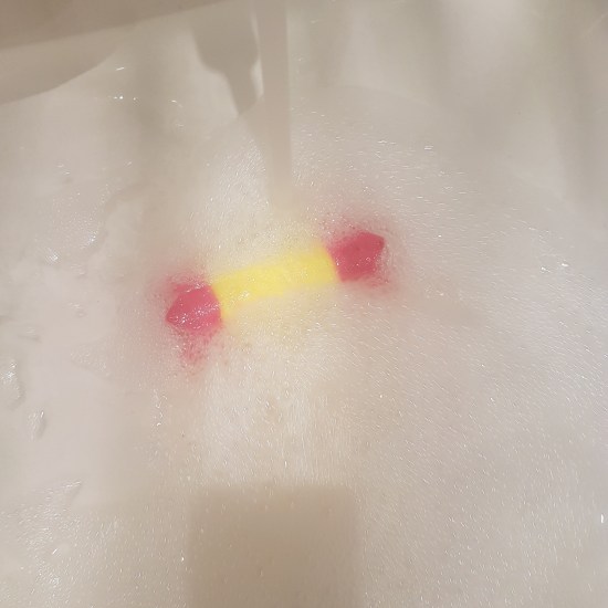 I do like how the pink and yellow colors form a nice orange bath together. The smell is pretty strong so your bathroom will definitely have this nice warm citrus-scent for the full day. And… because it is a bubble bar, there is lots of foam for a real excellent bathing experience.